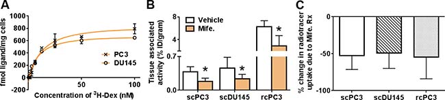 Figure 4: 18F-GR02 specifically accumulates in subcutaneous and renal capsule prostate cancer tumors. (A) Saturation binding curves with 3H-dexamethasone to determine the GR density per cell reveals that PC3 has a Bmax value of 1010 fmol/mg, while DU145 has a Bmax value of 783 fmol/mg, consistent with a previously reported value of 711 fmol/mg [27]. (B) Biodistribution data shows that accumulation of 18F-GR02 in subcutaneous PC3 and DU145 tumors (scPC3, scDU145) and subrenal capsule PC3 tumors (rcPC3) is suppressed with prior mife. treatment (25 mg/kg). The tumors were implanted in intact male nu/nu mice (n = 5/treatment arm), and biodistribution data was collected 60 minutes post injection. *P < 0.05 (C) Percent changes in radiotracer uptake in mife. treated tumors compared to vehicle shows that mife. suppresses 18F-GR02 tumor uptake in all tumor models or microenvironments.