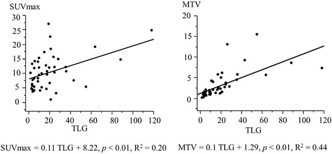 Figure 1: Simple regression analysis (SUVmax and TLG, MTV and TLG) in 47 patients with laryngeal or pharyngeal squamous cell carcinoma. Abbreviations: SUVmax: maximum standardized uptake value; TLG: total lesion glycolysis; MTV: metabolic tumor volume.