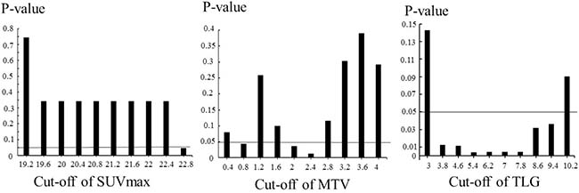 Figure 2: P-values of Wilcoxon’s test for the univariate overall survival analysis using different cut-off levels for 18F-fluorodeoxyglucose uptake parameters (SUVmax, MTV, TLG) of 51 patients with laryngeal or pharyngeal squamous cell carcinoma. Abbreviations: SUVmax: maximum standardized uptake value; TLG: total lesion glycolysis; MTV: metabolic tumor volume.