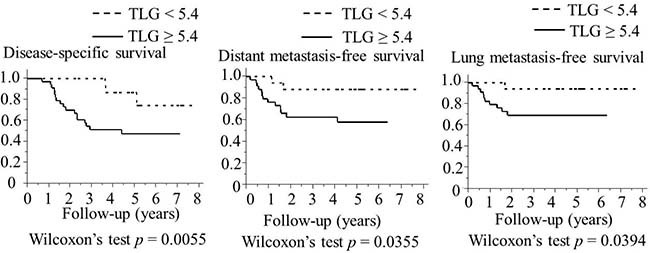 The patients with TLG ≥ 5.4 had a significantly shorter disease-specific survival (p < 0.0055), distant metastasis-free survival (p < 0.0355), and lung metastasis-free survival (p < 0.0394) than those with TLG < 5.4. However, no significant difference was noted in the locoregional recurrence-free survival (p = 0.16). The Kaplan–Meier curves for the disease- specific survival, distant metastasis-free survival, and lung metastasis-free survival are shown in Figure 4.