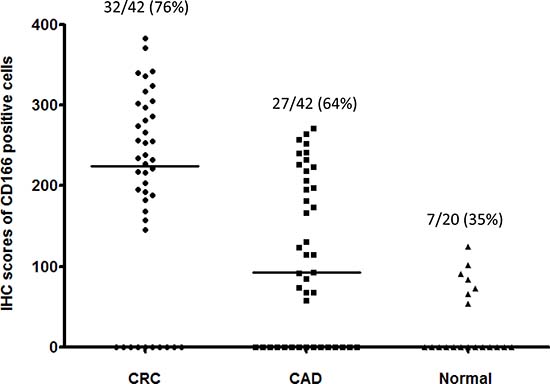 Figure 1: IHC scores of CD166-positive cells in 1) CRC, 2) CAD and 3) normal. Normal: adjacent normal colorectal epithelial tissues; the median IHC scores of each group is indicated by a black horizontal line.