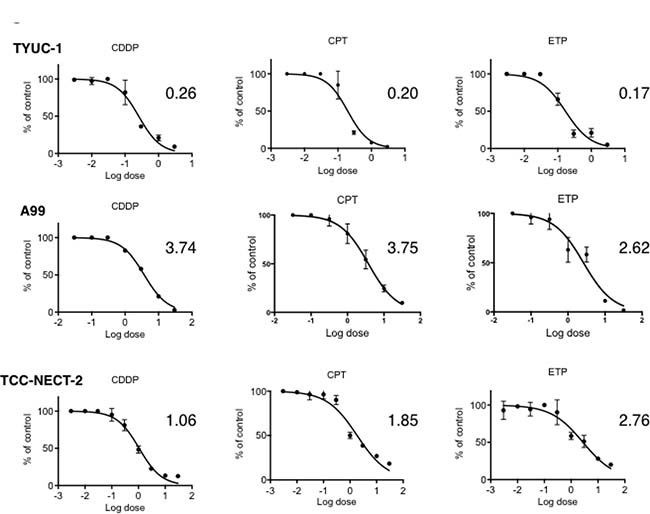 Figure 1: Dose-response curves of gastroenteropancreatic neuroendocrine carcinoma cell lines to CDDP, ETP and CPT-11 as single agents. 3 × 103 A99 cells or 1 × 104 TYUC-1 or TCC-NECT-2 cells were seeded per well in 96-well plates, and exposed to CDDP, ETP and CPT-11 for 96 hours. Each plotted value is the average ± SD, and IC50 for each agent is expressed in the unit of μg/mL.