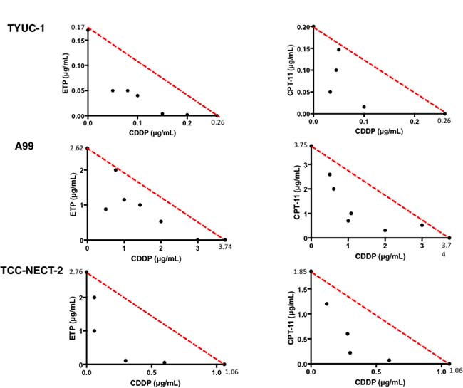 Figure 2: Classical isobolograms for TYUC-1, A99 and TCC-NECT-2. Synergism was maintained for the three cell lines at various drug concentrations in the combinations of CDDP and ETP, and CDDP and CPT-11.