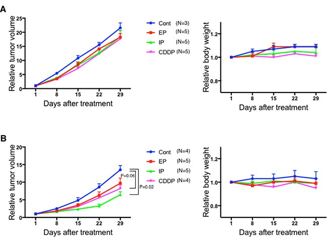 Figure 3: Changes of relative tumor volume and weight for each treatment group in mice inoculated with A99 (A) and TCC-NECT-2 (B). A99 and TCC-NECT-2 were inoculated subcutaneously (2 × 106 and 5 × 106 cells per mouse, respectively), and intraperitoneal drug injection was carried out when the tumor volume reached 130–250 mm3. The drug administration schedule was one cycle with a 28-day interval as follows: the CDDP group, 4.4 mg/kg CDDP on day 1; the CDDP/ ETP group (EP), 4.4 mg/kg CDDP on day 1 and 5.5 mg/kg ETP on days 1–3; the CDDP/ CPT-11 group (IP) 3.3 mg/kg CDDP on day 1 and 3.3 mg/kg CPT-11 on days 1, 8, 15. Each plotted value is the average ± SEM for relative tumor volume and relative weight.