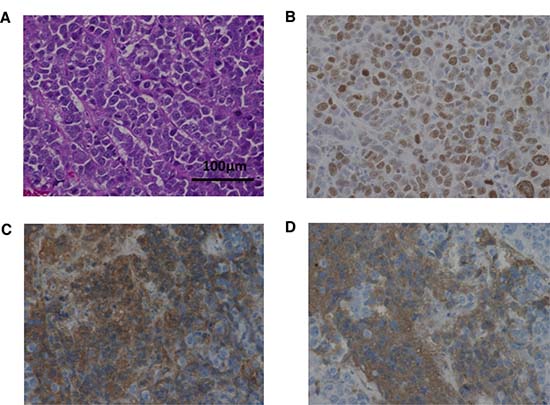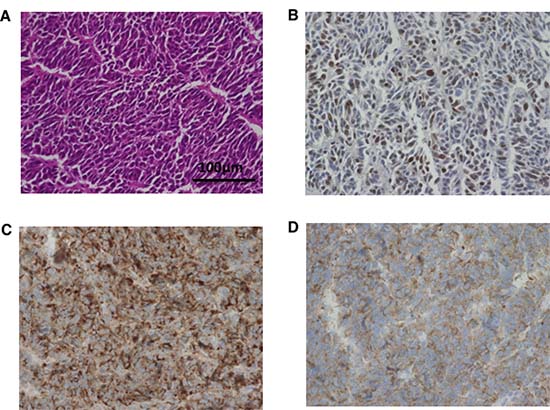 Figure 5: Histopathological images of tumor from control mice inoculated with TYUC-1. Microscopic images show small-sized uniform tumor cells with high nuclear cytoplasmic ratio (A), high Ki-67 labeling index values (58%) (B), and focal positivity of chromogranin A (C) and synaptophysin (D) (original magnifications ×400).