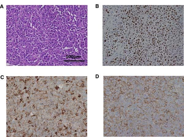 Figure 4: Histopathological images of tumor from control mice inoculated with A99. Small-sized tumor cells with high nuclear cytoplasmic ratio grow in a nested pattern with focal peripheral palisading (hematoxylin and eosin, original magnifications ×400, (A) Immunohistochemical analysis shows high Ki-67 labeling index values (74%) (B), and diffuse positivity of chromogranin A (C) and synaptophysin (D) (original magnifications ×400).