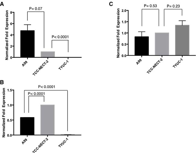 Figure 7: Gene expressions of ABCB1 (A), ABCC2 (B) and ABCC1 (C). Each target gene expression was normalized through setting GAPDH as a reference, and described as relative value to that in TCC-NECT-2. Each bar is the average ± SEM.