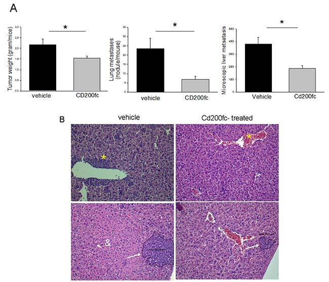 Figure 1: (A) Changes in tumor growth and metastasis of 4THM cells following CD200fc treatment. *p < 0,05 (B) Microscopic appearance of liver metastasis and neutrophil infiltration (*).