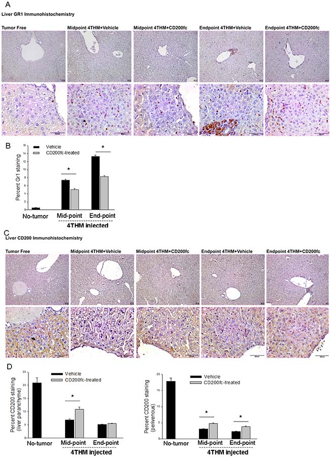 To further verify type of immune cells extravasated, Gr1 staining in liver tissue was performed which indicates granulocytes (neutrophils) and may also demonstrate the homing of myeloid derived suppressor cells. There were remarkable differences in the extent of perivascular Gr1+ cells (extravasated) as well as Gr1+ cells invading the paranchyme in CD200fc treated group at both mid-point and the end-point (Figure 2A, 2B). Specifically CD200fc treatment significantly decreased Gr1+ cells in liver tissue of mice injected with 4THM cells.