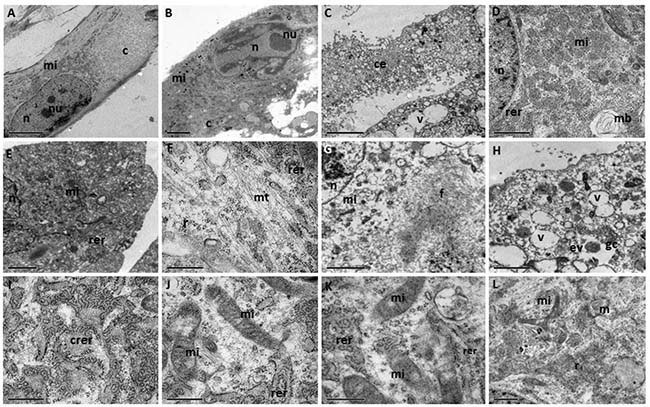 The main cytoplasmic characteristic exhibited by EPN cells is the presence of numerous mitochondria with evident crests, with varying morphologies, from small and electron-dense (Figure 4B, 4D, 4E, 4G, 4L) to large and elongated (Figure 4J, 4K).