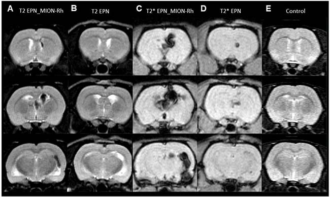 MRI analysis proved to be a valuable tool when combined with effective MION-Rh labeling techniques for monitoring the migration trajectory and EPN tumor growth over defined durations. This monitoring was performed by obtaining T2- and T2*-weighted MRIs. In animals that were injected with MION-Rh labeled EPN cells, we observed the appearance of ‘dark’ hypointense zones in the T2-weighted images, which were more evident in the T2*-weighted images. The presence of MION-Rh changes the magnetic susceptibility in these regions, which accounts for these ‘dark’ zones. In animals that were injected withnon-labeled EPN cells, we observed that the T2-weighted images showed hyperintense zones in the ventricles, i.e., ventricular dilatation, whereas in T2*-weighted images, we detected hypointense signals in the same areas. Both of these signal alterations are likely due to the site of the EPN cell injection, which experienced a tissue injury followed by an edema. MRI analyses show potential for monitoring tumor growth of EPN cells efficiently labeled with MION-Rh, which functioned as an outstanding tumor contrast agent.