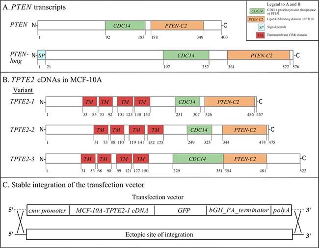 Figure 1: The PTEN and TPTE2 transcripts, and integration of the TPTE2 overexpression vector. (A) The PTEN and PTEN long transcripts. (B) The three TPTE2 transcript variants, TPTE2-1, TPTE2-2 and TPTE2-3. (C) The ectopic, random integration of the construct containing the cmv promoter, TPTE2 variant 1 (TPTE2-1) open reading frame, GFP tag, bGH-PA-terminator sequence and poly A tail. Box in upper right-hand corner of panel A shows color-coded domains in panels A and B.