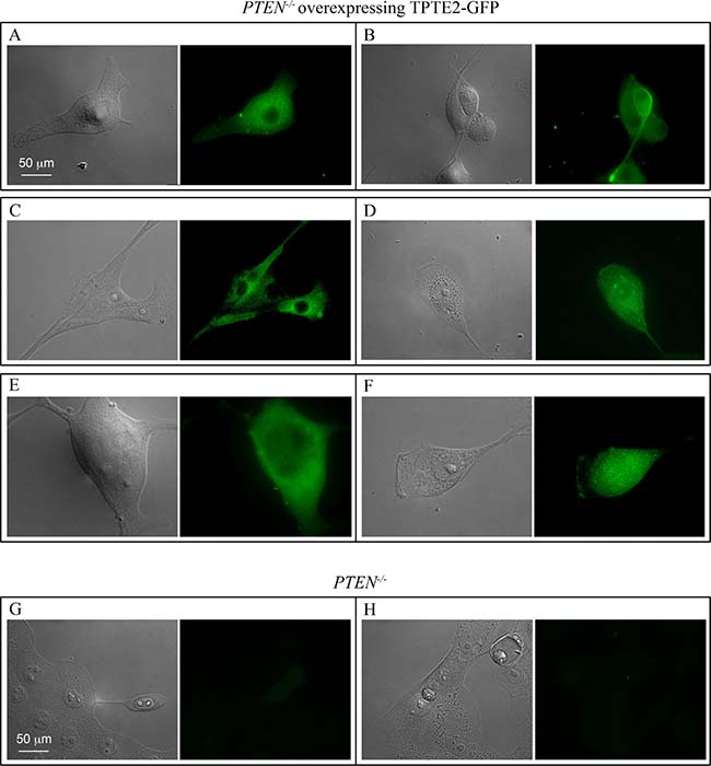 Figure 3: TPTE2oe-1 cells express the TPTE2-GFP fusion protein. (A–F) Examples of TPTE2oe cells expressing TPTE2-GFP. (G, H) Examples of PTEN–/– cells. Cells were treated with a mixture of two anti-GFP mAbs and then stained with the secondary fluorescent antibody against mouse mAb, anti H+L Alexa 488 antibody.