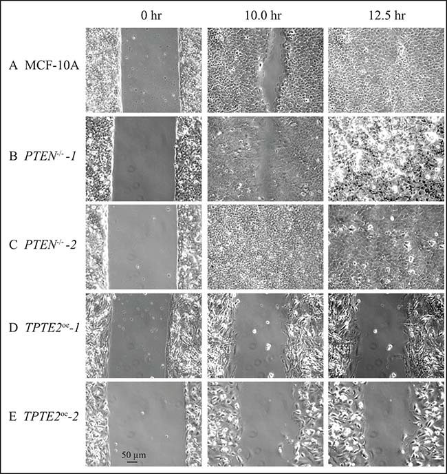 Figure 5: Representative images in DMEM+GFs medium reveal that the PTEN-/- mutant undergoes wound healing faster than parental MCF-10A cells and that overexpressing TPTE2 in PTEN-/- cells actually retards wound healing, accentuating the parental (PTEN+/+) phenotype. (A) MCF-10A, (B) PTEN-/--1 (C) PTEN-/--2, (D) TPTE2oe-1, (E) TPTE2oe-2.