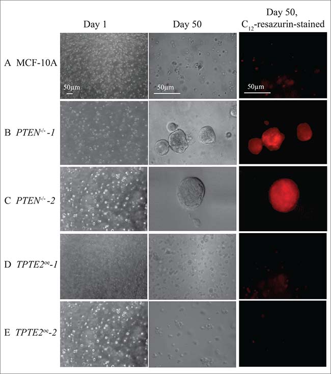 Transformed cells have been demonstrated to acquire anchorage-independent growth in soft agar [65]. Previous experiments in soft agar suggested that deletion of PTEN in MCF-10A cells did not confer this characteristic [10]. Here, however, using a 3D model [66, 67] of transparent Matrigel, which is composed primarily of laminin, collagen and heparin sulfate proteoglycans [68], in DMEM-GF medium, we found that PTEN–/– cells acquired anchorage independent growth and viability. When seeded in 3D Matrigel and incubated for 50 days, the great majority of MCF-10A cells died off (Figure 10A). The dramatic decrease in cells was verified by the negligible levels of staining with C12-resazurin (Figure 10A). C12-resazurin identifies metabolically active cells [69]. In marked contrast the two PTEN–/– strains formed large aggregates after 50 days, which stained with C12 resazurin (Figure 10B, 10C). Overexpression of TPTE2 reinstated the characteristics of cell death (Figure 10D, 10E). Similar results were obtained for 10 regions of duplicate preparations for each tested strain.