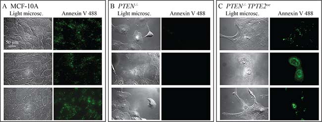 Figure 11: Overexpression of TPTE2 in the PTEN–/– mutant reverses the mutant-acquired loss of annexin V binding, the latter a characteristic associated with apoptosis. Three pairs of representative images, light microscopic and fluorescent, are provided for annexin V-stained preparations. (A) MCF-10A cells. (B) PTEN–/– cells. PTEN–/– TPTE2oe-1 cells.