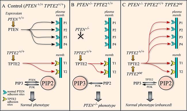 Figure 12: Working model for the rescue of the PTEN–/– mutant phenotype by overexpressing TPTE2. (A) Model of PTEN and TPTE2 binding in control cells (PTEN+/+TPTE2+/+). PIP2 dominates because of PTEN dephosphorylation of PIP3. In this model of control cells, all PTEN binding sites are filled by PTEN and all TPTE2 sites by TPTE2. (B) Model of binding in PTEN–/– cells (PTEN–/–TPTE2+/+). PTEN binding sites are not occupied and PIP3 dominates because of the absence of PTEN. PTEN receptors are unoccupied whereas TPTE2 receptors are occupied by TPTE2. (C) Model of binding in the TPTE2 overexpressor (PTEN–/–TPTE2+/+TPTE2oe). Overexpressed TPTE2 leads to TPTE2 binding to both PTEN binding sites as well as TPTE2 binding sites. PIP2 dominates, resulting in a phenotype equivalent to that of control cells. P1, P2, P3, P4: PTEN binding sites. T1, T2: TPTE2 binding sites. PI3K, PI3 kinase.