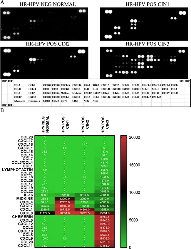 Figure 1: Proteomic array shows detection of chemokines in pooled aliquots from 9 samples in following categories hrHPV negative, cytological normal; hrHPV positive, CIN1; 3) hrHPV positive CIN2; and 4) hrHPV positive CIN3 (A). Relative pixel density ratio for each protein on the array was calculated using ImageJ by normalising to negative controls (NEG CONTROL) (B). Heatmap representing array results with pixel density.