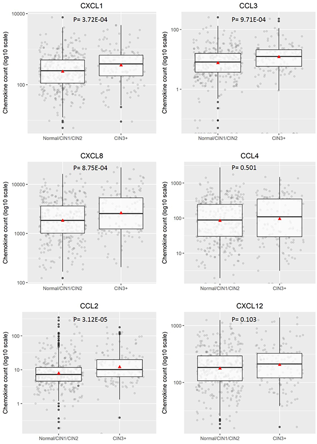 Figure 2: Distribution of chemokine level (pg/200 ug) for ≤CIN1 versus CIN2+. Boxplots demonstrate the median, lower and upper quartile of the values, with the mean value represented as a triangle. Individual data points are shown as grey dots. Values deemed to be outliers of the distribution are shown as black dots. P values were calculated using Mann–Whitney test.
