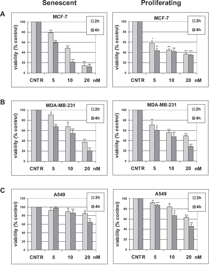 Figure 1: Effect of trabectedin on tumor cells viability. Tumor cells were induced to undergo senescence by treatment with doxorubicin. Height (A), five (B) or six (C) days after release from doxorubicin, senescent cells were treated with 5 to 20 nM trabectedin for indicated times. Proliferating tumor cells were also treated with 5 to 20 nM trabectedin for indicated times. Cell viability was determined 72h after trabectedin washout. Data are mean ± S.D. of one representative experiment out of two (MDA-MB-231) or three (MCF-7 and A549) independent experiments, performed in triplicate.