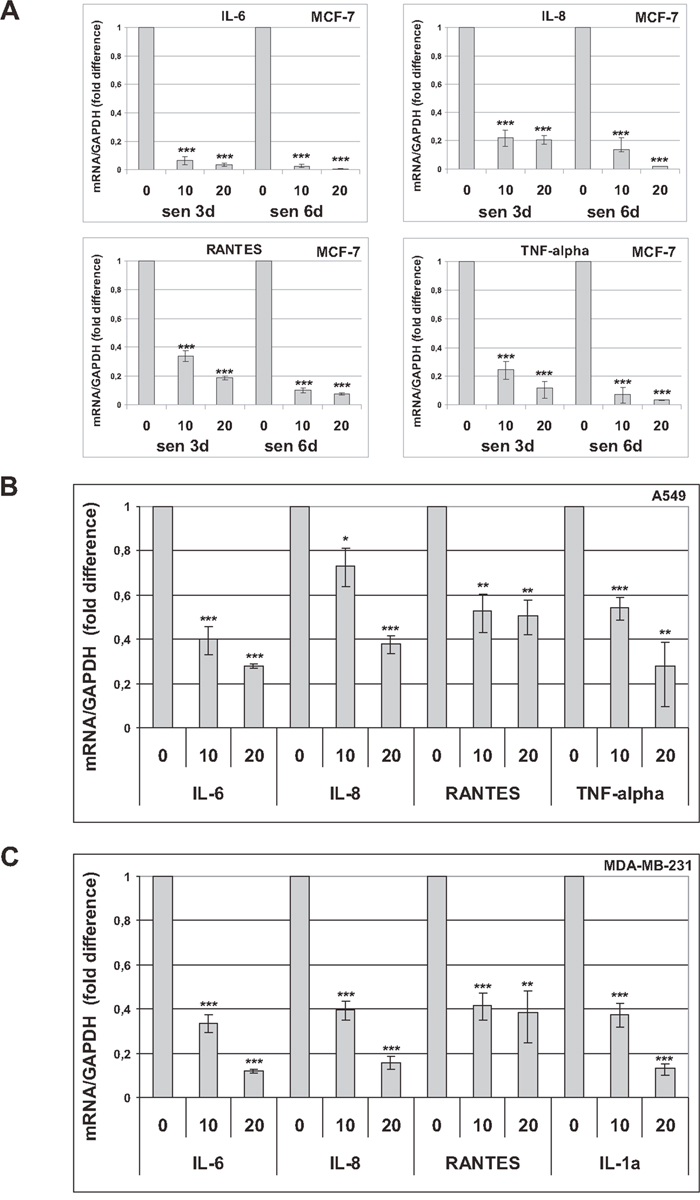 Figure 2: Trabectedin reduces the SASP. Cytokines and chemokines were analyzed by real-time PCR in premature senescent tumor cells, 72h after drug washout. (A) Three and six days after release from doxorubicin, senescent MCF-7 cells were treated with 10 or 20 nM trabectedin for 1h. (B) Seven days after release from doxorubicin, senescent A549 cells were treated with 10 or 20 nM trabectedin for 2h. (C) Seven days after release from cisplatin, senescent MDA-MB-231 cells were treated with 10 or 20 nM trabectedin for 1h. Data are mean ± S.D. of one representative experiment out of two to four independent experiments performed in triplicate.