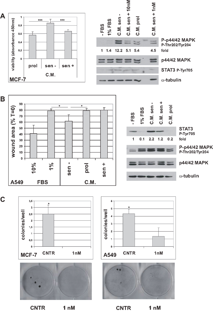 The SASP mediates many harmful effects of senescence [4, 11]. Since trabectedin appears to reduce and modulate the senescent secretome, we investigated the effects of conditioned media (C.M.) from trabectedin-treated or untreated senescent tumor cells on MCF-7 cells viability. As shown in Figure 4A left, C.M. from senescent cells significantly increased the viability of MCF-7 cells, as compared to C.M. from control, proliferating cells. This stimulatory effect was nullified using the C.M. obtained from senescent cells 6 days after trabectedin treatment. In addition, western blot analyses of proliferating MCF-7 cells, serum-starved and then stimulated with C.M., showed that phosphorylation of p44/42MAPK was strongly induced by C.M. from senescent cells, and substantially reduced using the C.M. from trabectedin-treated senescent cells (Figure 4A, right). In line with data shown in Figure 2 and Figure 3, p44/42MAPK phosphorylation was equally reduced by exposing senescent cells to either high concentration trabectedin for a short time (10 nM, 1h) or low concentration trabectedin for longer time (1 nM trabectedin, 24h). STAT3 phosphorylation was not affected by any treatment in MCF-7 cells (Figure 4A, right). Furthermore, in wound healing assays, A549 migration was induced by C.M. from senescent cells, as compared to both C.M. from proliferating cells and control medium supplemented with 1% FBS (Figure 4B and Supplementary Figure 8). In contrast, C.M. from trabectedin-treated senescent cells did not sustain cell migration (Figure 4B and Supplementary Figure 9). It is worth noting that proliferation rate of A549 cells was not influenced by C.M., either from untreated or from trabectedin-treated senescent cells (Supplementary Figure 9C), indicating that the observed effects on cell migration were not a consequence of a general inhibition of cell proliferation. Accordingly, also C.M. from cells silenced for RelA/p65, which show a low SASP phenotype [6], did not affect the proliferation of A549 cells (Supplementary Figure 9C). In line with these findings, western blot analysis of proliferating A549 cells, serum-starved and then stimulated with C.M. from senescent cells, showed no change in p44/42MAPK phosphorylation (Figure 4B, right). On the other hand, C.M. from senescent A549 cells induced a robust STAT3 phosphorylation, which was reduced using the C.M. from trabectedin-treated senescent cells (Figure 4B, right). These results are consistent with the scratch wound healing data and suggest that STAT3 plays a relevant role in paracrine SASP signaling in A549 cells. Since STAT3 is a well known downstream effector of IL-6 and TNF-alpha, these data further support the ability of trabectedin to inhibit proinflammatory cytokines secretion from senescent tumor cells. On the whole, these data demonstrate that trabectedin reduces the SASP, and reduces its biological effects in vitro. The observed differences between MCF-7 and A549 cells in response to C.M., i.e. stimulation of proliferation and p44/42MAPK phosphorylation vs. stimulation of migration and STAT3 phosphorylation, are consistent with variations in SASP composition between cell types, leading to diverse downstream effects [4].