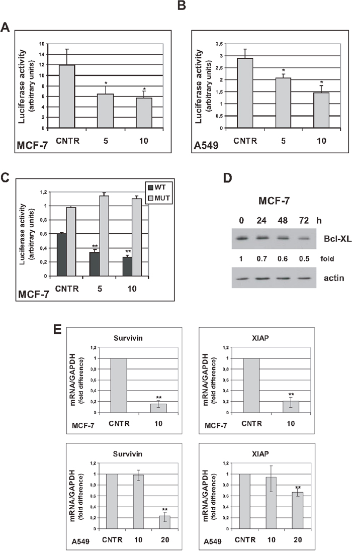 Figure 5: Trabectedin represses NF-κB reporter plasmid activity. (A) Five days after release from doxorubicin, senescent MCF-7 were transiently cotransfected with Ig-κB luciferase reporter and Renilla luciferase reporter plasmids. After 24h, cells were either untreated (CNTR) or treated with trabectedin (5 and 10 nM) for 1h. Luciferase activity was measured 24h after drug washout. Data are mean ± S.D. of one representative experiment out of two independent experiments performed in triplicate. (B) Seven days after release from doxorubicin, senescent 549 cells were cotransfected as in (A), and treated with trabectedin 5 and 10 nM for 2h. (C) Four days after release from doxorubicin, senescent MCF-7 cells were transiently cotransfected with either Bcl-XL κB-luciferase reporter plasmid (WT) or Bcl-XL-Δ-κB-luciferase reporter plasmid, with mutated κB sites (MUT), and Renilla luciferase reporter plasmid. After 24h, cells were treated as in (A). (D) Four days after release from doxorubicin, senescent MCF-7 cells were treated with 5 nM trabectedin for 1h. Bcl-XL protein was detected for up to 72h after drug washout. Filters were stripped and re-probed with anti-actin antibody. Bcl-XL levels, normalized to the relative actin levels, are reported as fold change of untreated cells. (E) Senescent MCF-7 cells (seven days after release from doxorubicin) were treated with 10 nM trabectedin for 1h; senescent A549 cells (six days after release from doxorubicin) were treated with 10 or 20 nM trabectedin for 2h. Expression of Survivin and XIAP was estimated by real-time PCR 72h after drug washout. Data are mean ± S.D. of one representative experiment out of two independent experiments performed in triplicate.
