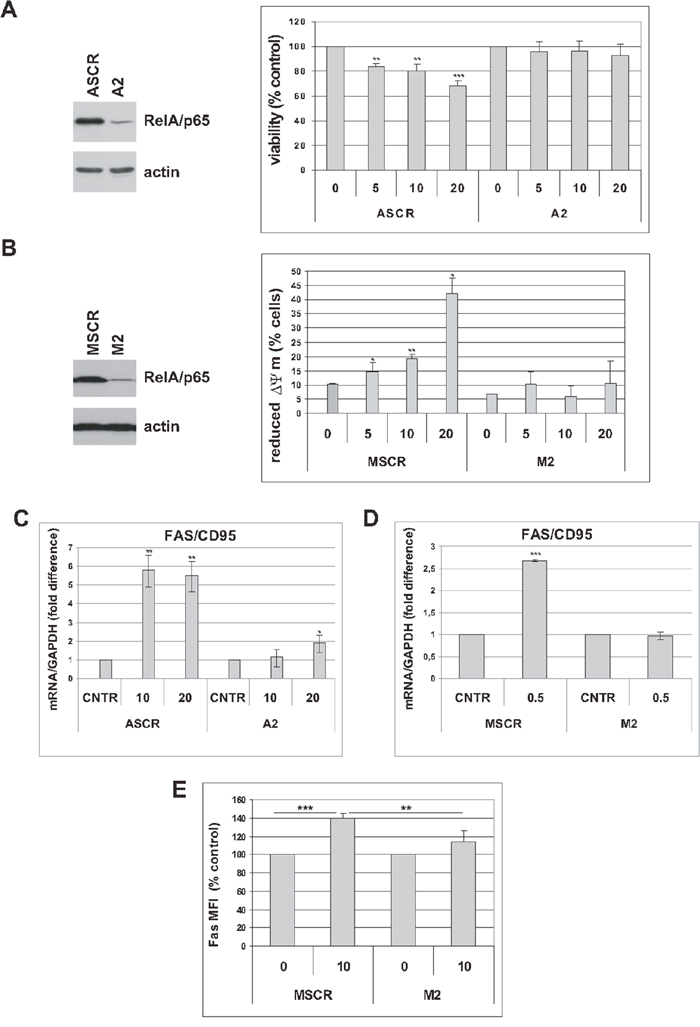 Figure 6: RelA/p65 mediates cytotoxic effects of trabectedin in senescent tumor cells. (A) Left: five days after release from doxorubicin, expression of RelA/p65 was analyzed in senescent A549 cells, scrambled (ASCR) or RelA-interfered (A2). Filters were stripped and reprobed with anti-actin antibody as a loading control. Right: five days after release from doxorubicin, senescent ASCR or A2 cells were treated with 0 to 20 nM trabectedin for 4h. Cell viability was determined 72h after drug washout. Data are mean ± S.D. of one representative experiment out of two independent experiments performed in triplicate. (B) Left: four days after release from doxorubicin, expression of RelA/p65 was analyzed in senescent MCF-7 cells, scrambled (MSCR) or RelA-interfered (M2). Filters were stripped and reprobed with anti-actin antibody as a loading control. Right: four days after release from doxorubicin, senescent MSCR or M2 cells were treated with 0 to 20 nM trabectedin for 1h. Apoptosis was estimated by TMRE staining 72h after drug washout. Data are mean ± S.D. of one representative experiment out of three independent experiments. (C) Five days after release from doxorubicin, senescent ASCR and A2 cells were treated with 0 to 20 nM trabectedin for 2h. Fas expression was estimated by real-time PCR 48h after drug washout. Data are mean ± S.D. of one representative experiment out of two independent experiments performed in triplicate. (D) Four days after release from doxorubicin, senescent MSCR and M2 cells were treated with 0.5 nM trabectedin for 24h and Fas expression was estimated by real-time PCR. Data are mean ± S.D. of one representative experiment out of two independent experiments performed in triplicate. (E) Senescent MSCR and M2 cells were treated with 10 nM trabectedin for 1h and analyzed for Fas expression 72h after drug washout. Levels of surface Fas are expressed as relative mean fluorescence intensity (MFI) minus background fluorescence of isotype-matched control. Data are mean ± S.D. of one representative experiment out of two independent experiments performed in triplicate.