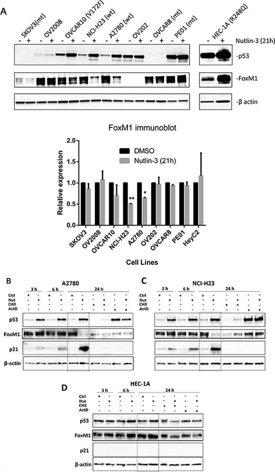 Figure 1: Functional p53 is required for FoxM1 suppression by Nutlin-3. (A) In cell lines with functional p53, p53 expression is induced, and FoxM1 expression is suppressed by Nutlin-3. Cell lines with known TP53 mutations are indicated by “mt” and wild type cell lines are indicated by “wt”. Note, although OVCAR10 contains a mutant allele (V172F), p53 expression is induced, and FoxM1 expression is suppressed by Nutlin-3, suggesting the wild type copy is sufficient to suppress FoxM1 expression. Significant down-regulation of FoxM1 was observed in NCI-H23 (**, P ≤ 0.01) and A2780 (*, P ≤ 0.05). FoxM1 expression was normalized with β-actin and was expressed relative to DMSO-treated controls. (B-D) Time-course experiments indicate that p53 is induced within 3 hours of Nutlin-3 treatment in A2780 and NCI-H23 cells with wild type p53, and FoxM1 downregulation is observed at 24 hours in these cells. In HEC-1A cells with mutant p53, neither p53 nor FoxM1 was affected by Nutlin-3 at various time points. These results indicate functional p53 is required for FoxM1 downregulation by Nutlin-3. Cells were treated with vehicle (0.05% DMSO), 10 μM Nutlin-3 for 3, 6 or 24 h, or with CHX, CHX+Nutlin-3, ActD or ActD+Nutlin-3 for 24 h. Proteins were isolated and subjected to Western analysis. β-actin was used for normalization of loading. Downregulation of FoxM1 at 24 hours following Nutlin-3 treatment is highlighted in the dotted box.