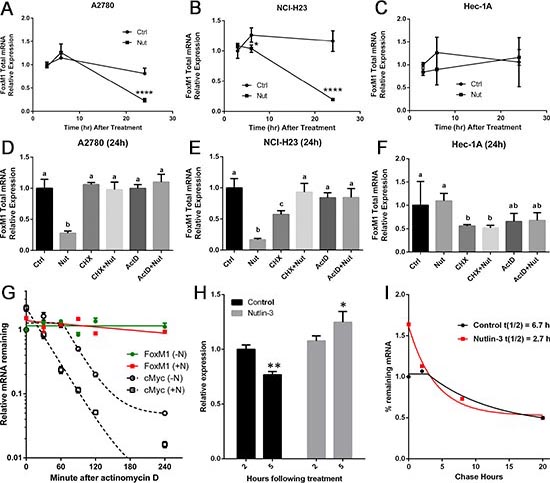Figure 2: FoxM1 mRNA is downregulated by Nutlin-3 in TP53 wild type cells but not in TP53 mutant cells. Upper panel (A-C): Cells were treated with vehicle (0.05% DMSO) or 10 μM Nutlin-3 for 3, 6 or 24 h. Lower panel (D-F): Cells were treated with DMSO, Nutlin-3, CHX, CHX+Nutlin-3, ActD or ActD+Nutlin-3 for 24 h. Total RNA was isolated and subjected to real-time RT-PCR analysis. GAPDH was used for normalization of FoxM1 expression. It is important to note that FoxM1 mRNA is quite stable in the presence of ActD in cell lines with wild type TP53 (D&E). Data are presented as Mean ± SD of 3 experiments. **** indicates P < 0.0001 by paired t-test. Difference alphabet letters indicate significant differences (P < 0.05) across treatments by One-Way ANOVA. Nutlin-3 treatment enhances FoxM1 mRNA decay. (G) Analysis of the effect of Nutlin-3 on FoxM1 mRNA stability using actinomycin D. A2780 cells were treated with or without Nutlin-3 for 14 hours, followed by actinomycin D treatment for 30, 60, 120, or 240 min. Total RNA was isolated and subjected to real-time RT-PCR analysis of FoxM1. cMyc mRNA was used as a positive control. (H) Effects of Nutlin-3 on nascent FoxM1 transcription in A2780 cells. Click-iT EU labeling followed by real-time RT-PCR was used to compare nascent FoxM1 mRNA synthesis at 2 h or 5 h after treatment with vehicle or Nutlin-3. * indicates P < 0.05; ** indicates P < 0.01. (I) Effects of Nutlin-3 on FoxM1 mRNA decay. A2780 cells were treated with or without Nutlin-3 for 5 h before pulse-labeling for 1 h. Total RNA was isolated at 0, 2, 8, or 20 h post labeling and subjected to RT-PCR analysis. FoxM1 mRNA half-life was calculated using GraphPad Prism6.