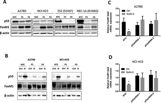 We then designed experiments to confirm that downregulation of FoxM1 by Nutlin-3 was dependent on the upregulation of functional p53. To do this, we generated batches of stable cell lines each expressing two different p53-targeting shRNAs in A2780, NCI-H23, ES2, and HEC-1A cells. Cells stably expressing non-targeting control shRNA (NTC) served as the control. As shown in Figure 3A, knockdown of p53 protein expression by p53 shRNA-1 (P1) or p53 shRNA-2 (P2) resulted in increased expression of FoxM1 protein in both A2780 and NCI-H23 cells as compared to NTC. To our surprise, knockdown of p53 in TP53 mutant HEC-1A cells resulted in a decreased in FoxM1 protein levels, suggesting the possibility that mutant TP53 in HEC-1A positively regulates FoxM1 expression. In contrast, the knockdown of S241F mutant in ES2 cells resulted in upregulation of FoxM1. These results highlight the heterogeneity in the regulation of FoxM1 by p53 mutants, with S241F mutant still retaining the negative regulatory effect on FoxM1 expression while TP53 mutant R248Q acquires the gain of positive regulatory effect on FoxM1 expression.