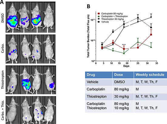 Figure 5: Thiostrepton enhances in vivo carboplatin sensitivity in HEC-1A cancer cells. (A) Luciferase-label HEC-1A (2.5 million cells/mouse) cells were intra-peritoneally injected into nude mice, and in vivo bioluminescence imaging was perform 1 week later. Mice were placed into four groups (7-9 mice per group) (DMSO, carboplatin, thiostrepton, and carboplatin plus thiostrepton) and treated with corresponding drugs. Weekly bioluminescence imaging was performed to monitor tumor growth. Representative images taken at Day 25 are shown. (B) Total photon flux were collected, and mean values plus standard errors were plotted as line graphs. A significant decrease in tumor volume was observed at Day 18 (week 3) in the groups treated with carboplatin alone or in combination with thiostrepton. ***, p < 0.001 in multiple t-test using Holm-Sidak method at α = 0.05. The graph was plotted as two sections with a break at Day 21 to indicate change in dosing of carboplatin.