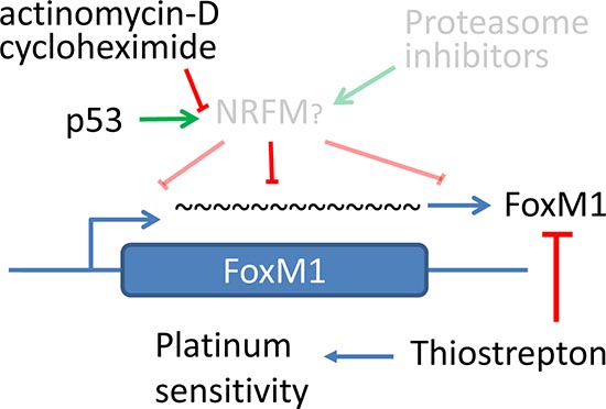 Figure 7: Hypothetical model of FoxM1 regulation by p53 through a putative negative regulator. FoxM1 is negatively regulated by a putative negative regulator of FoxM1 (NRFM) as previously proposed by Andrei Gartel. Putative NRFM may regulate FoxM1 expression at protein level by enhancing FoxM1 degradation or via mechanisms involving decreased mRNA stability. p53 stimulates the expression/function of this NRFM through transcription- and translation-dependent mechanisms, and consequently downregulates FoxM1. Transcription inhibitor actinomycin D or translation inhibitor cycloheximide blocks FoxM1 downregulation by p53. Prior model, shown in gray, is proposed by Gartel et al [53], and indicates that putative NRFM may be stabilized by proteasome inhibitors. Such putative NRFM with high rate of turnover may be stabilized by proteasome inhibitors but may be destabilized by inhibition of constitutive expression by either ActD or CHX, leading to enhanced FoxM1 stability.