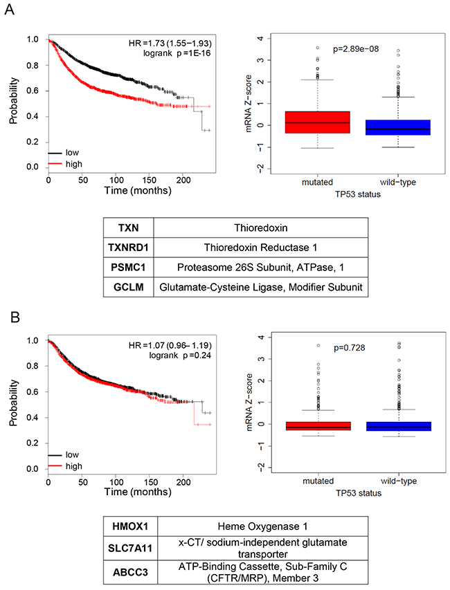 Figure 4: NRF2 transcriptional program activated by mutant p53 is associated with poor overall prognosis and with the mutant status of p53 in breast cancer patients. (A) (upper panels) Left, association of the mutant p53 activated signature with a survival of breast cancer patients. The red curve (“high”) represents the survival of patients with high expression of mutant p53 activated signature, black curve (“low”) – low expression of mutant p53 activated signature. HR – hazard ratio; log-rank P – log-rank test p-value for the curves comparison. Right, association of the mutant/wt TP53 status and expression of NRF2 targets activated by mutant p53 listed in the table (TXN, TXNRD1, GCLM, PSMC1). Box plot: diff – difference in mean gene expression in mutant vs. wt p53 status samples; p-value is derived from Mann–Whitney U test. Centre represents the median, box extremes indicate the first and third quartiles, and whiskers extend to the extreme values included in the interval calculated as ±1.58 IQR/sqrt(n), where the IQR (interquartile range) is calculated as the third quartile minus the first values included in the interval calculated as ±1.58 IQR/sqrt(n), where the IQR (interquartile range) is calculated as the third quartile minus the first quartile. (lower panel) List of genes included in the signature. (B) (upper panels) Left, association of the mutant p53 repressed signature with survival of breast cancer patients. The red curve (“high”) represents the survival of patients with high expression of mutant p53 repressed signature, black curve (“low”) – low expression of mutant p53 repressed signature. HR – hazard ratio; log-rank P – log-rank test p-value for the curves comparison. Right, association of the mutant/wt TP53 status and expression of NRF2 targets repressed by mutant p53 (HMOX1, x-CT, ABCC3). Box plots: as in (A), diff – difference in mean gene expression in mutant vs wt p53 status samples; p-value is derived from Mann–Whitney U test). (lower panel) List of genes included in the signature.