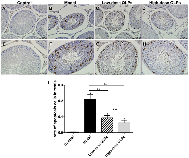 Figure 2: TUNEL staining of apoptotic cells. (A-D) magnification ×200; (E-H) magnification ×400; and (I) percentage of apoptotic cells in the seminiferous tubules. All data are presented as the mean ± SEM of at least three experiments. *P<0.05 versus the control group;*P<0.05 vs. Control, **P<0.05 vs. Model, ***P<0.05 vs. Low-dose QLPs.