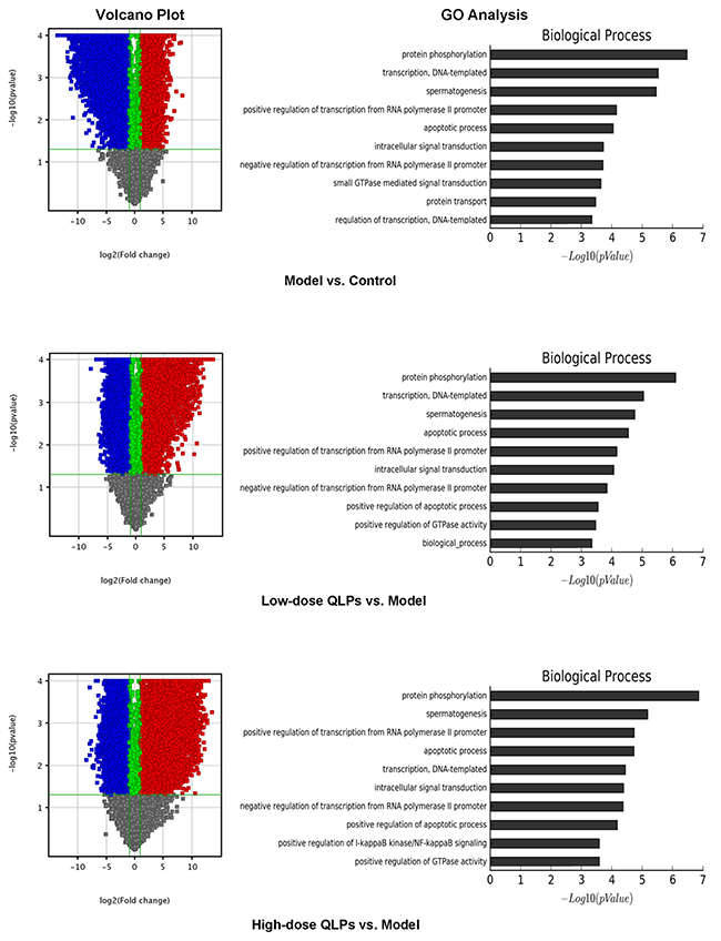 We compared gene expression profiles among groups by microarray analysis. As expected, significant differences in gene expression were observed between oligoasthenospermia model rats and controls. In addition, of the 20,912 genes that were analyzed, 8403 and 12,509 were up- and downregulated in group L respectively and 8328 and 11,941 genes were up- and downregulated, respectively, in group H as compared to group M. Only 135 genes were differentially expressed between the two QLPs-treated groups. Volcano plot filtering providing the above difference and GO analysis revealed the top five biological processes associated with differentially expressed genes as protein phosphorylation; apoptosis; transcription, DNA-templated; spermatogenesis, and positive regulation of transcription from RNA polymerase II promoter (Figure 3). We examined apoptosis-related genes that were differentially expressed between group M and groups L and H and found that most were concerned with mitochondrial apoptosis, including Bcl-2, Bax, cytochrome C, and caspase-9, and -3 (Table 2). Studies on the other four biological processes also have been carried out. These results will be published in the relevant articles.