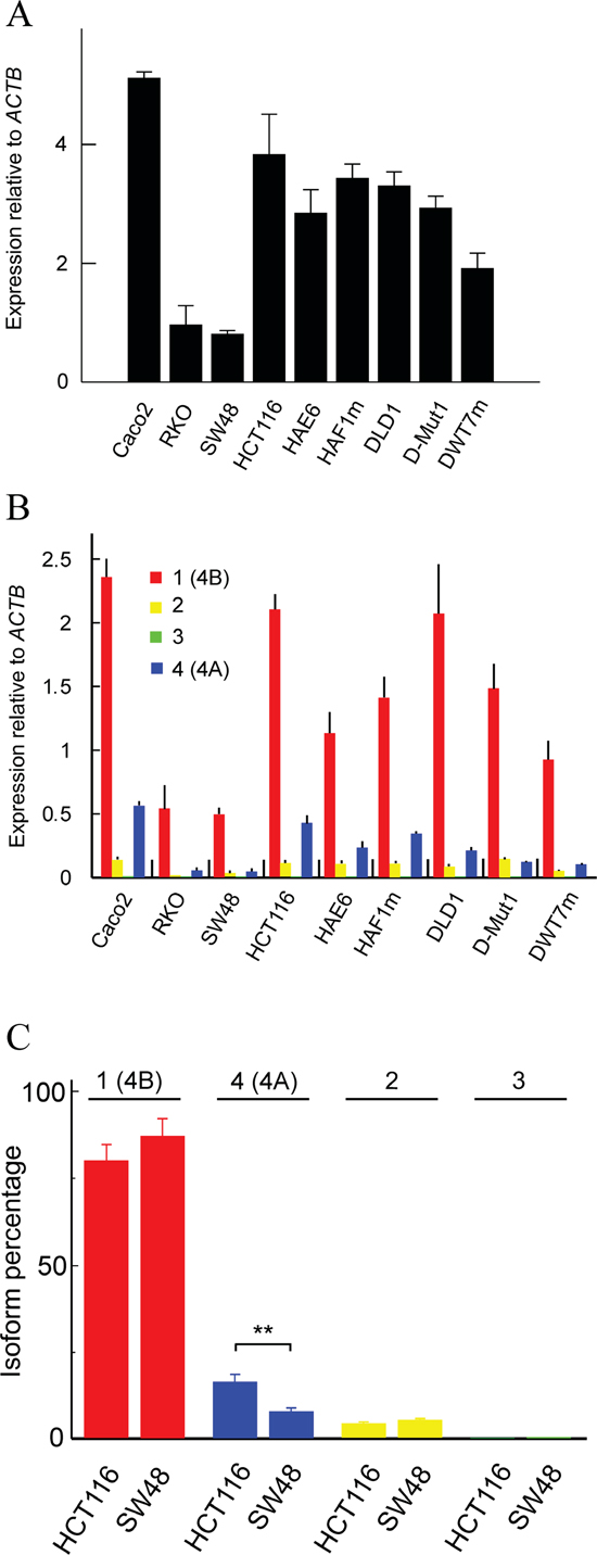 The expression of whole KRAS is highly variable from line to line, being higher in Caco2 and lower in RKO and SW48. The expression level is roughly similar in lines HCT116 and DLD1 and the cells derived from these parental lines show a lower expression level, although a slight compensatory effect for the loss of one of the alleles seems to occur (Figure 2A). The expression of the individual isoforms, relative to ACTB, is given in Figure 2B. Isoform 1 (4B) is the most abundant in all the cell lines studied; present results agree with those of Tsai et al. [23]. The level of isoform 3 is negligible in all the cell lines, but the expression of the non-translated isoform 2 is comparable, or even slightly higher than that of isoform 4 (4A).