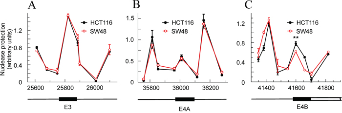 Figure 3: Nucleosome occupancy at the exons involved in alternative splicing in HCT116 and SW48 cells. (A) exon 3. (B) exon 4A. (C) exon 4B. The plots give the nuclease protection in arbitrary units against the position of each amplicon centre in the locus. The maps below identify the exon location as black rectangles. In (C), the gray rectangle refers to the non-translatable, transcribed exon. The results correspond to three determinations for each amplicon (Panels A and C) or to six determinations from two independent experiments (Panel B) and are given as the mean ± standard deviation. ** p<0.01.