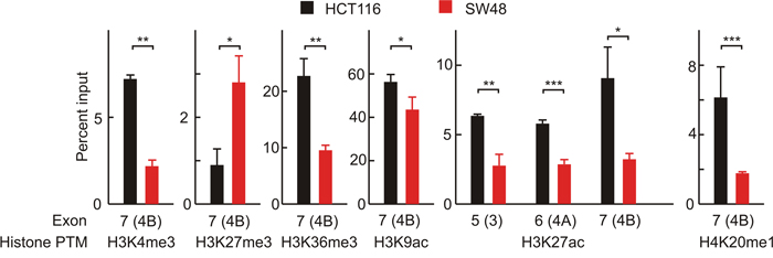 Figure 5: Nuc-ChIP analysis of histone epigenetic modifications in nucleosomes located over the exons 3, 4A and 4B. Only those histone PTMs that significantly differ between HCT116 and SW48 cells are depicted. Three independent Nuc-ChIP experiments were carried out and the figure gives the results of one representative experiment. qPCR analysis were carried in triplicate and the mean ± standard deviation is plotted. * p<0.05; ** p<0.01; *** p<0.001.