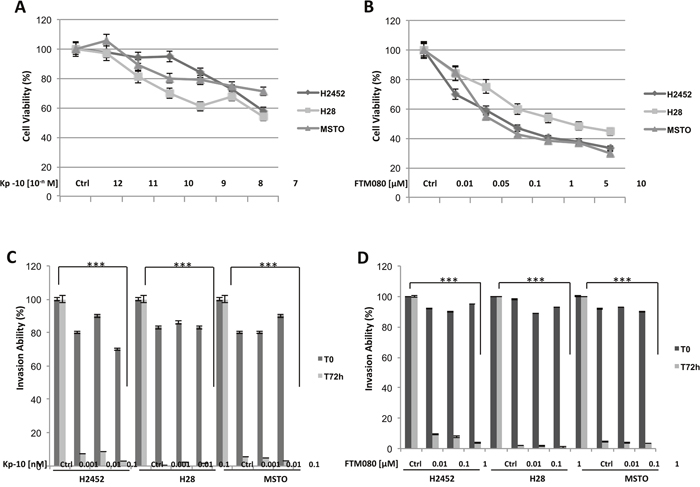 Figure 2: Effect of Kisspeptin and FTM080 on the proliferation and the invasiveness of mesothelioma cell lines. (A-B) Cell viability, (C-D) invasion ability. Data are the average ± SD of three independent experiments, each performed in triplicate. Asterisks indicate statistical significance, as determined by the Student-t test (*** P ≤ 0.001).