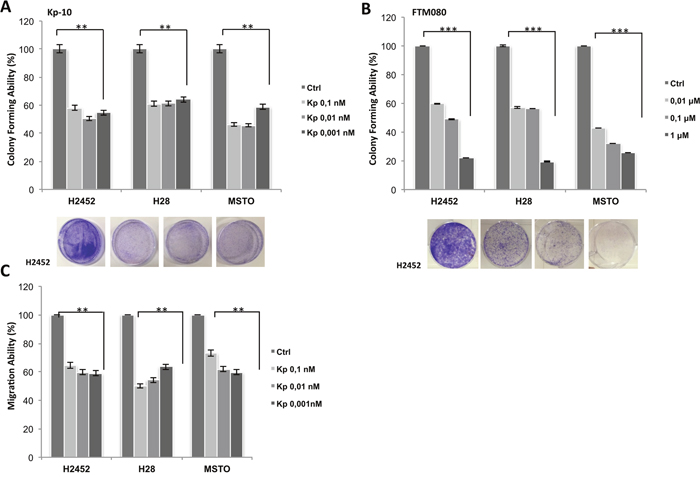 Figure 3: Effect of Kisspeptin and FTM080 on the migration and colonies formation of mesothelioma cell lines. (A-B) Colony formation assay, (C) migration ability. Data are the average ± SD of three independent experiments, each performed in triplicate. Asterisks indicate statistical significance, as determined by the Student-t test (** P ≤ 0.01; *** P ≤ 0.001).