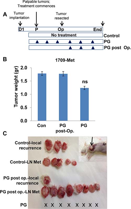 Figure 5: PG545 as neoadjuvant. (A) Schematic diagram of the experiment. PDX was established from a spontaneous metastasis of PDX 1709 to lymph node (1709-Met). The 1709-Met PDX was implanted in 18 NOD/SCID (D1). Once palpable (day 7), mice were left untreated as control (n = 12) or were treated with PG545 (n = 6; 20 mg/kg once a week). Three weeks later, when tumors reached a diameter of 10–15mm, tumors were resected and weighed (B). Six (out of 12) of the former control mice received PG545 (PG post-Op) while the other 6 mice were kept untreated (Con). One month later, mice were sacrificed and examined for local recurrence and lymph node (LN) metastases (C). X represents no detectable tumors or tumor metastases in the indicated treatment regimen. An example of lymph node metastasis in this model is shown in (C, inset). Note that unlike the original 1709 PDX, the 1709-Met PDX does not respond well to PG545 (B). However, PG545 is highly effective in prevention of tumor recurrence and metastasis if present before tumor resection (neoadjuvant).