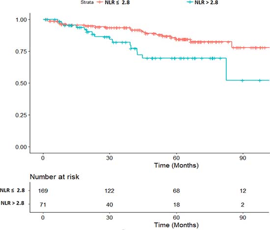 Figure 1: Overall survival depending on the pre-radiation Neutrophil to Lymphocyte Ratio (NLR). (HR 2.23 CI 95% (1.14–2.36), p = 0.02)
