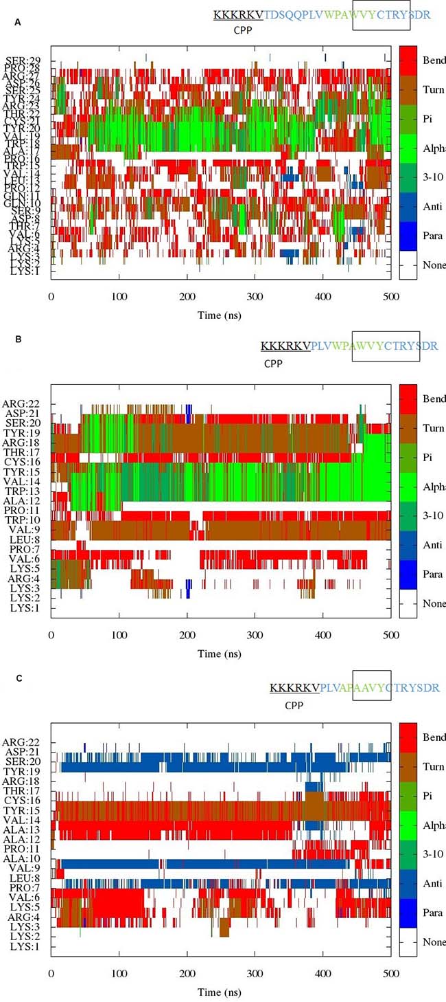 Figure 1: (A) Evolution of the secondary structure from scaled MD simulation of EN1-iPep (Peptide 1). The results indicate the presence of helical/turn conformation near the C-terminus of the peptide. A rectangular box in the sequence indicates the presence of stable secondary structure. (B) Evolution of the secondary structure from scaled MD simulation of Peptide 2. The results indicate the presence of helical/turn conformation near the C-terminus of the peptide. A rectangular box in the sequence indicates the presence of stable secondary structure. (C) Evolution of the secondary structure from scaled MD simulation of Peptide 3. The results indicate the presence of turn/bend conformation within the hexapeptide motif upon mutation of tryptophans to alanine. The presence of a region in the sequence with turn/bend conformation is indicated by a rectangular box.