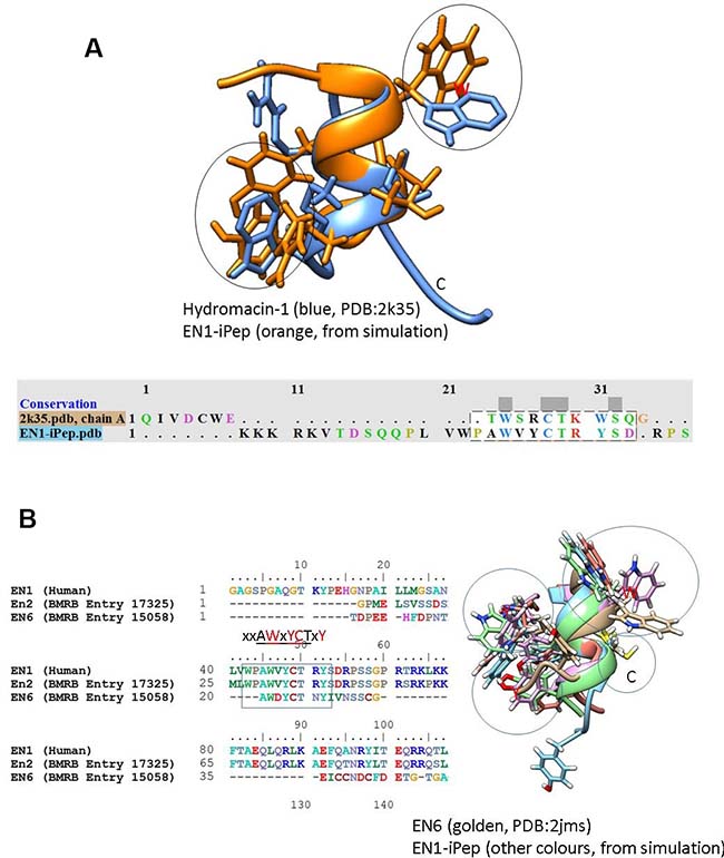 Figure 2: Structural alignment of conformations from simulations of Peptide 1 with (A) hydromacin and EN6 (B) NMR structures. The alignment indicates that the backbone conformations are similar in these structures, although the chi torsional angles (orientations) of aromatic residues are different. The sequence alignment of EN1 with EN2 and EN6 from the BMRB database indicates the presence of semi-conserved hexapeptide motifs (highlighted with a rectangular box).