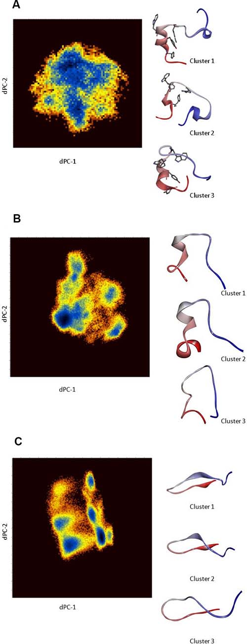 Figure 4: (A) Dihedral angle PCA (dPCA) of the backbone and side-chain atoms of Peptide 1 for residues 12–27. The diagrams are pseudo-colour representations of the density functions corresponding to the fluctuations of the N, C′, C atoms in the top two eigenvectors. The representative conformation (coloured from N- to C-terminus) from each dPCA cluster. Clusters 1 and 3 clearly reveal the presence of a helical conformation in the region encompassing the hexapeptide motif. (B) Dihedral angle PCA (dPCA) of the backbone and side-chain atoms of Peptide 2 for residues 7–22. The diagrams are pseudo-colour representations of the density functions corresponding to the fluctuations of the N, C′, C atoms in the top two eigenvectors. The representative conformation (coloured from N- to C-terminus) from each dPCA cluster is shown. (C) Dihedral angle PCA (dPCA) of the backbone and side-chain atoms of Peptide 3 for residues 7–22. The diagrams are pseudo-colour representations of the density functions corresponding to the fluctuations of the N, C′, C atoms in the top two eigenvectors. The representative conformation (coloured from N- to C- terminal) from each dPCA cluster are shown. These results are from scaled MD simulations with ʎ = 0.7.