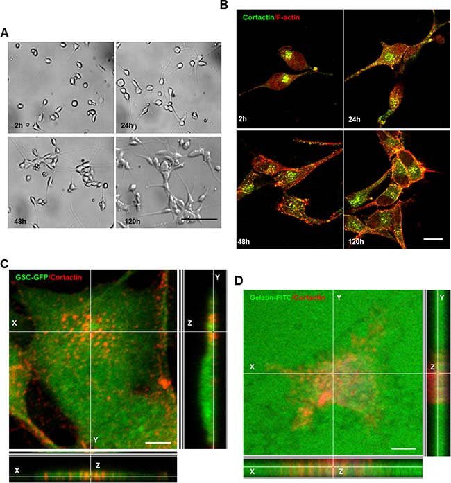 Figure 1: GSCs upon adhesion form invadopodia. (A) GSCs were seeded on matrigel-coated coverslips for different time periods 2, 24, 48 and 120 h. (B) GSCs were fixed and stained with anti-cortactin antibody (green) and rhodamine phalloidin (red). GSCs adhesion on matrigel was accompanied by invadopodia formation. (C) GFP-expressing GSCs were stained with cortactin antibody (red) and analyzed with confocal microscopy. Z-sectioning showed cortactin staining at columnar structures rising perpendicular to the substratum. (D) GSCs were plated on fluorescent (green) gelatin-coated coverslips for 16 h before fixation and staining with cortactin (red). Confocal imaging demonstrated that matrix degradation occurred in regions where cortactin-containing invadopodia protruded into the gelatin layer. Bars: (A) 100 μm; (B) 30 μm; (C) 50 μm; (D) 50 μm.