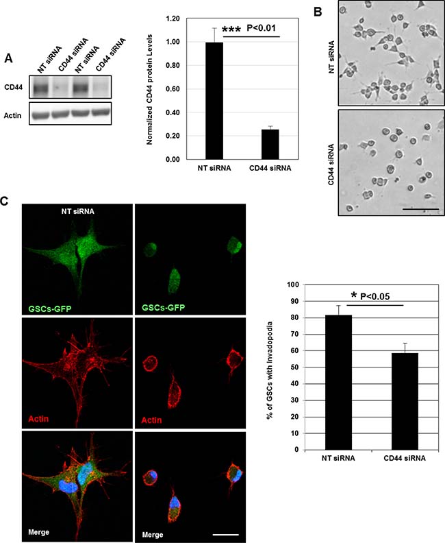 Figure 3: CD44 outside-in signaling controls invadopodia formation. (A) Cell lysates of GSCs transfected with NT- or CD44- siRNA were analyzed by Western blotting and probed for CD44 and Actin. SiRNA silencing strategy was efficient leading to 75% decrease in CD44 protein levels; ***P < 0.01 (n = 3). (B) CD44-siRNA knockdown affected GSCs spreading capacity on Matrigel-coated substrates. (C) NT- or CD44- siRNA transfected GSC-GFP cells were fixed and stained with rhodamine phalloidin and DAPI. CD44 rapid depletion strongly affected cells ability to form invadopodia. CD44 knockdown significantly reduced the % of GSCs with invadopodia; *P < 0.05 (n = 3). Graphs presented as means ± SD. Differences with a probability level P < 0.05 were considered significant in one-way ANOVA. Bars: (B) 50 μm; (C) 30 μm.