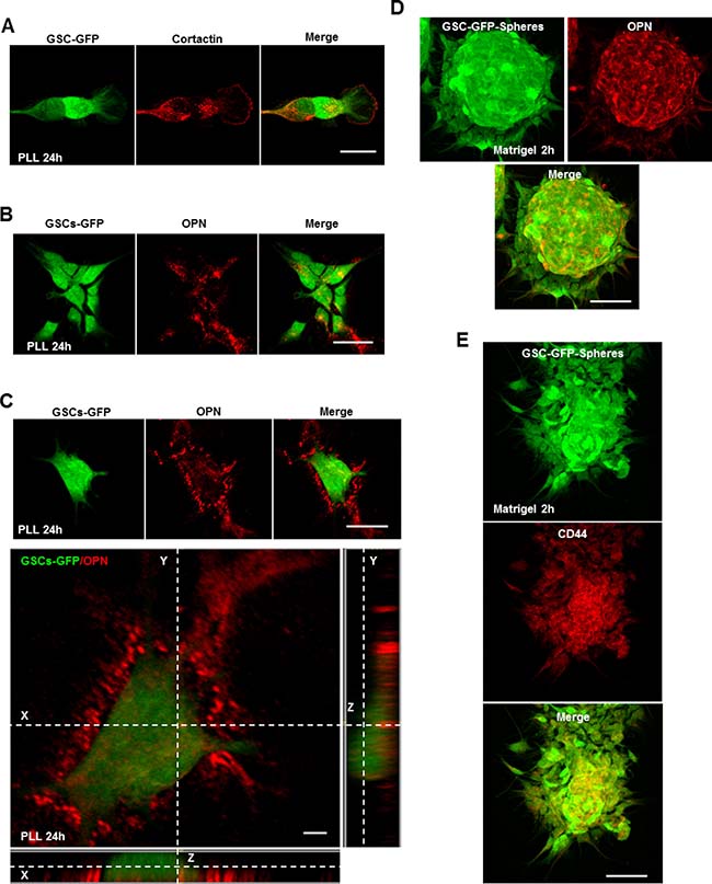 Figure 4: The CD44 ligand OPN controls invadopodia assembly. (A) GFP-expressing GSCs were seeded on PLL-coated coverslips for 24 h and stained for cortactin (red). GSCs cultured on PLL for 24 h presented numerous invadopodia puncta. (B) GSC-GFP cells were plated on PLL for 24 h and then stained for secreted OPN ligands (red). Immunofluorescence images revealed OPN localization (red) to regions where GSC-GFP cells adhered. (C) Z-stack analysis confirmed OPN localization to the extracellular space underneath the cells. (D) GSC-GFP spheres were cultured on matrigel-coated coverslips for 2 h, fixed and stained with an OPN antibody (red). Immunofluorescence analysis showed OPN enrichment within the multicellular bulk. (E) GFP-expressing spheres were plated on matrigel-coated substrates for 2 h and stained with a CD44 antibody. OPN deposition within the multicellular bulk was accompanied by CD44 enrichment. Bars: (A) 30 μm; (B) 40 μm; (C) 40 μm; 4 μm; (D) 50 μm; (E) 50 μm.