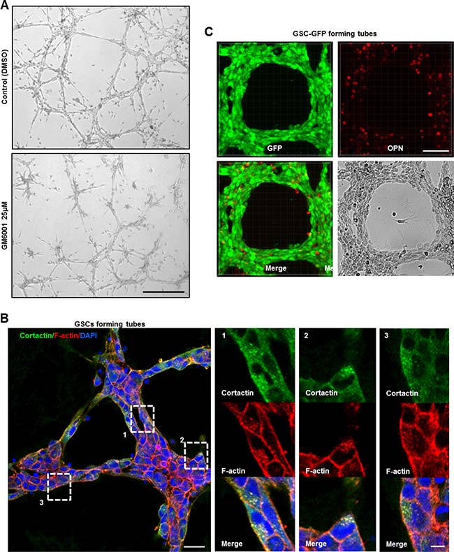 Figure 6: Functional invadopodia formed in GSCs drive in vitro tubes assembly. (A) Tube formation assay of GSCs treated or not with 25 μΜ of the MMP inhibitor GM6001 as the cells were plated on the gelled matrix. GM6001 addition dramatically impacted on GSCs capacity to form intact tubes relative to DMSO-treated cells. (B) Intact GSC-GFP-derived tubes were fixed and stained with cortactin (green), rhodamine phalloidin (red) and DAPI (blue). Boxed regions provide a higher magnification of F–actin and cortactin positive dot-like invadopodia structures formed on GSCs tightly compacted into the tubes. (C) GSC-GFP cells aligned into tubes were fixed and stained for secreted OPN ligands. OPN staining (red) was present to the extracellular space where GSCs adhered and formed the tubular structures. Bars: (A) 100 μm; (B) 30 μm; 5 μm; (C) 50 μm.